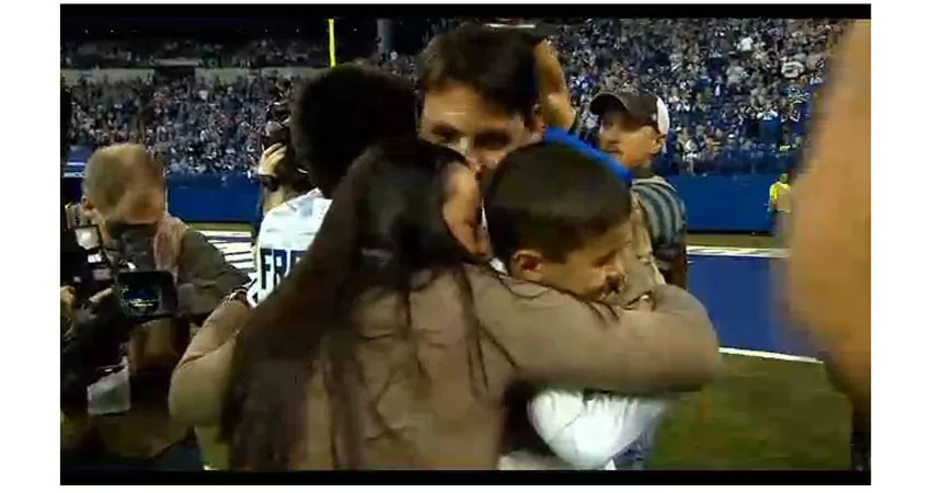 Little did the family know that Dad (Sergeant Ino) was riding in the back seat! Sergeant Ino was scheduled to come home from Afghanistan at the end of the month for Thanksgiving. His wife Christin and sons and Dominique and David got a big surprise. When the father stepped out of the car, the rest of the family ran from midfield to embrace Sergeant Ino near the end zone. The family reunited early thanks to the Wish for Our Heroes organization and a big helping hand from McAfee.