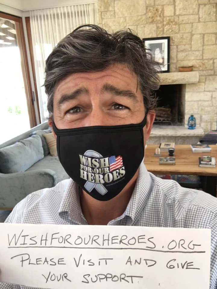 You may know him as Coach Taylor from Friday Night Lights or possibly John Rayburn from Bloodline, but we know him as Kyle Chandler, an incredible friend and supporter of our military families in Central Texas. Here, Kyle proudly shows his support for Wish For Our Heroes Inc. If you would like your own W4OH mask, made in the USA by our Veterans, simply make a $15 donation, which will feed a high-risk COVID Veteran for one week: