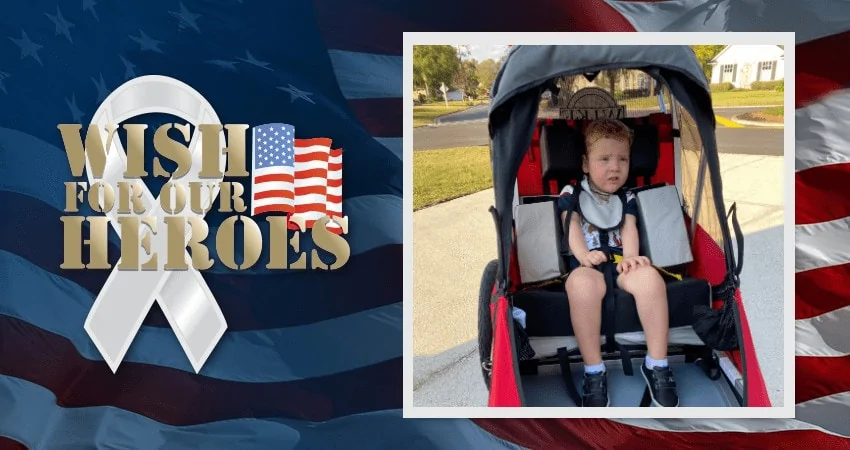 Marie is an active member of the Navy and reached out to Wish For Our Heroes with a request for her son Noah. Noah was born prematurely and has Dyskinetic Quadriplegic Cerebral Palsy. Marie and her husband look for ways to get Noah outside to enjoy and explore his environment, but most equipment for Noah costs significantly more than equipment that is available for an able-bodied child. Wish For Our Heroes was able to purchase an $880 Wike Trailer for Noah that allows him to sit upright, safely and comfortably.