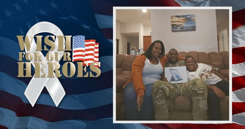 Wish for Our Heroes is dedicated to assisting the everyday needs of active military members. We were able to help meet Robert’s needs by providing the family with the $1,600 required for a new computer. Robert is now able to continue his work toward his degree!